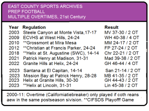 EL CAJON – In the 21st Century, East County schools (including Christian and Patrick Henry high schools) played seven gmd hicxh extended into multiple overtime period. Entering the 2023 season, there were seven such contests,.
